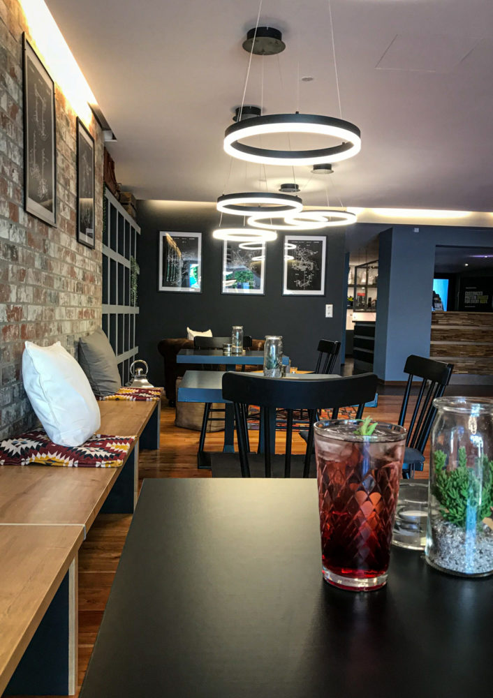 Neue gemütliche Sofas, ein Bücherregal und Unikate als Dekoration runden das Gesamtbild ab. Alles zum Thema Sport und Bewegung: ein urbaner und entspannter Look, der zum Verweilen einlädt.